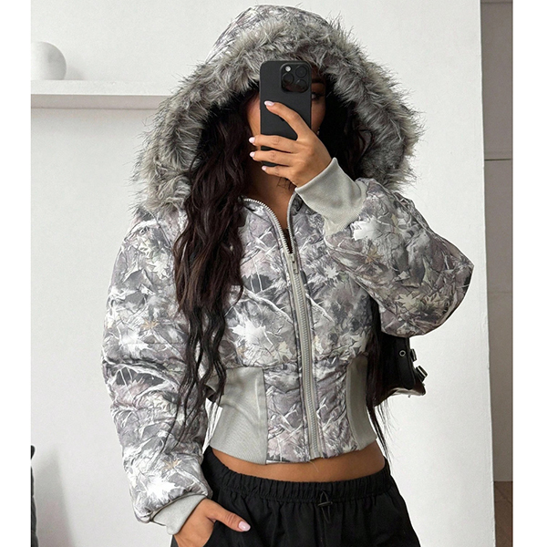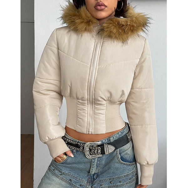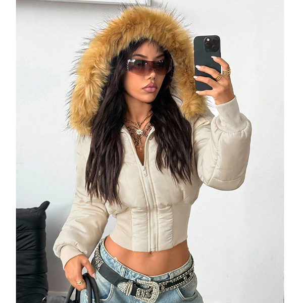 Fashion Artificial Fur Spliced Hooded Long Sleeve Quilted Crop Jacket