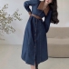 Fashion Artificial Leather PU Spliced Collar Long Sleeve Front Button Denim Dress with Belt
