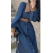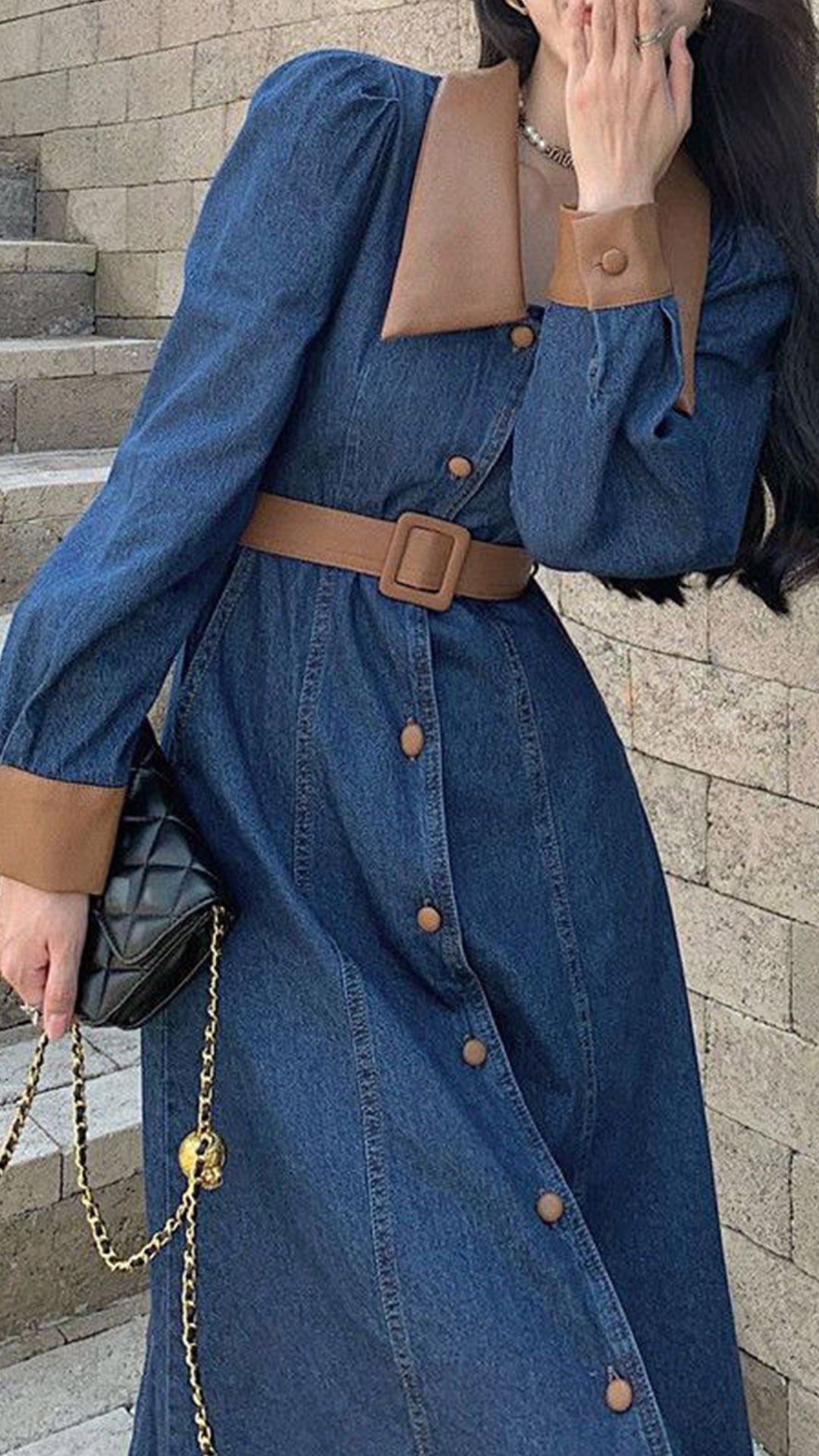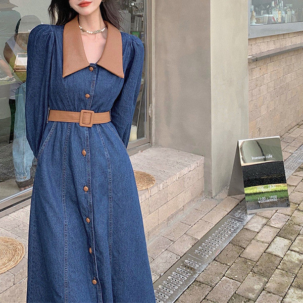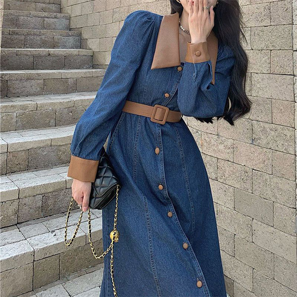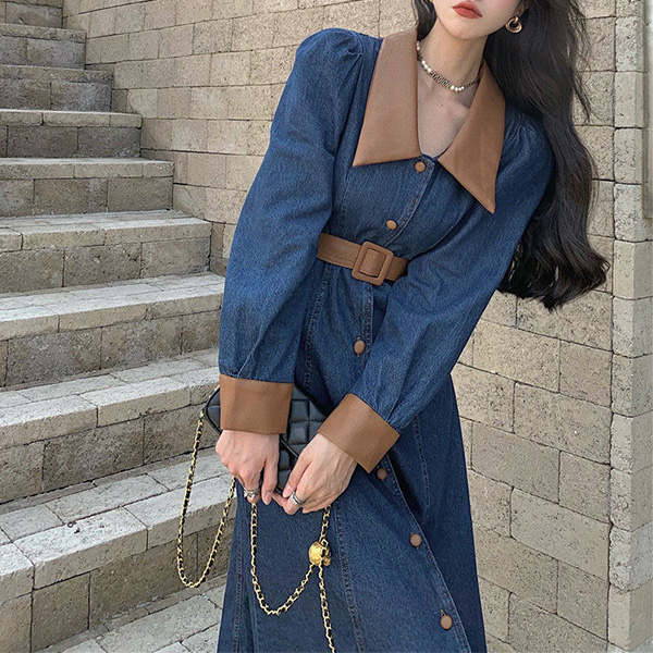 Elevate your style with this fashion-forward denim dress with a belt. The unique design features a combination of denim and artificial leather materials, creating a modern and edgy look. The spliced collar and cuff adds a touch of sophistication. The front button closure and belt detail accentuate your waist and create a flattering silhouette. Pair this dress with boots or heels for a trendy and chic outfit.