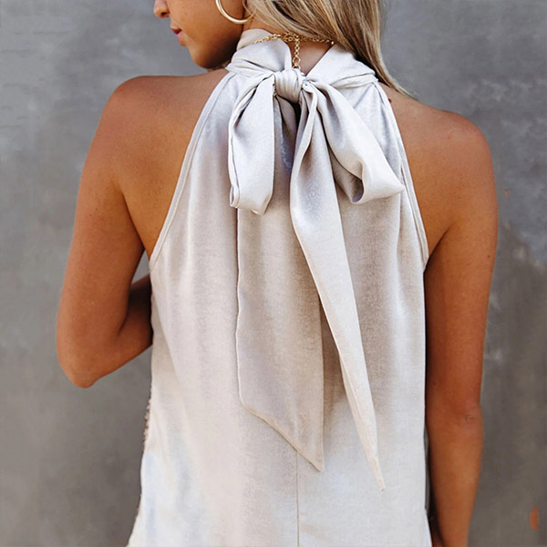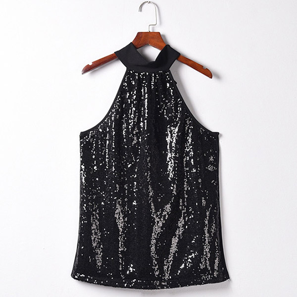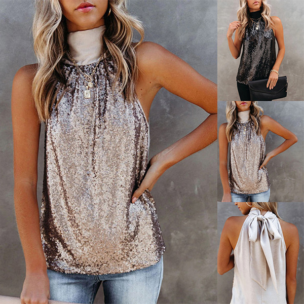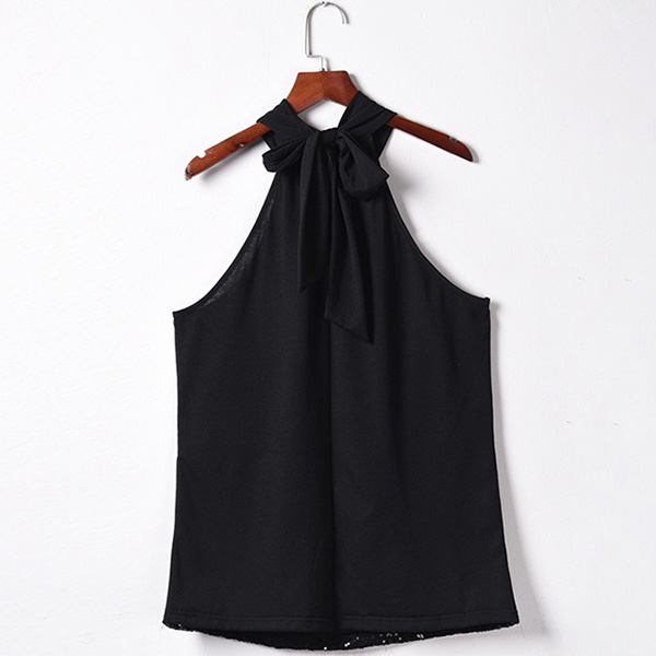 Fashion Back Bow-knot Sleeveless High Collar Sequin T-shirt