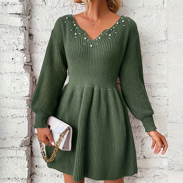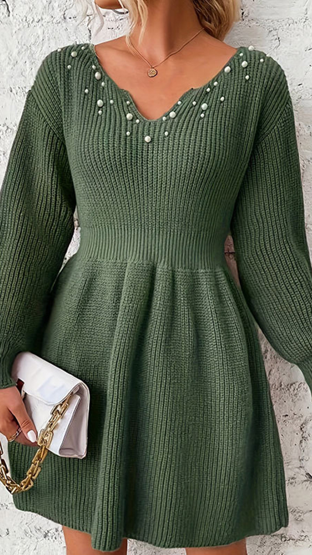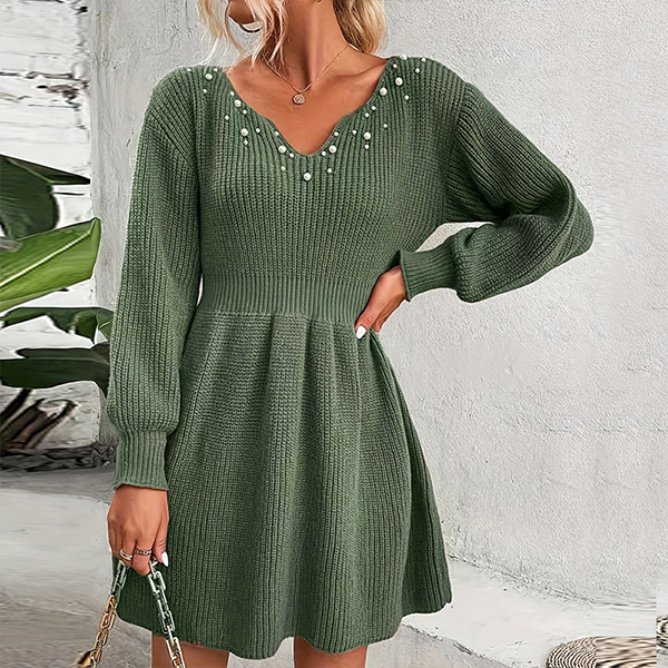 This chic and cozy sweater dress features a flattering V-neckline adorned with trendy bead detailing that adds a touch of glamour to your look. The cinched waist creates a feminine and figure-flattering silhouette, accentuating your curves in all the right places. Whether you're heading to the office, running errands, or meeting friends for brunch, this sweater dress is a versatile and stylish option. Pair it with ankle boots for a fashion winter look~