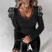 Fashion Bead V-neck Puff Long Sleeve Ribbed Shirt