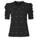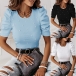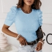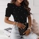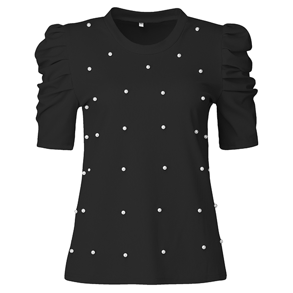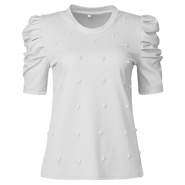 Fashion Beaded Round Neck Puff Short Sleeve Ribbed Shirt