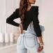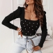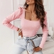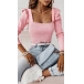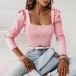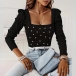 Fashion Beaded Square Neck Puff Long Sleeve Ribbed Shirt