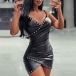 Fashion Beaded V-neck Irregular Hemline Artificial Leather PU Bodycon Dress