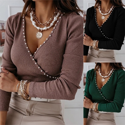 Fashion Beaed V-neck Long Sleeve Knitted Shirt