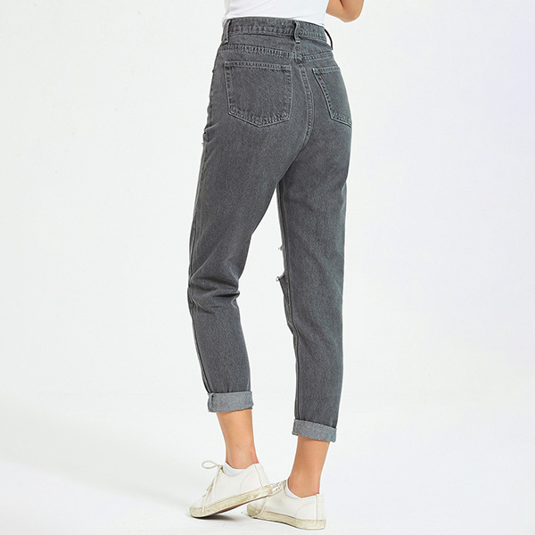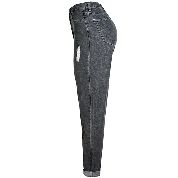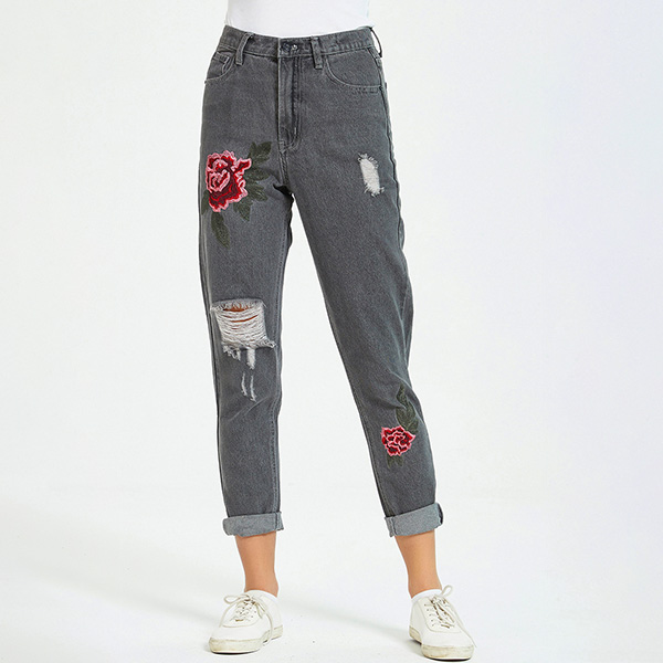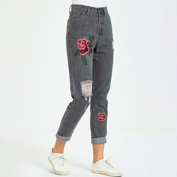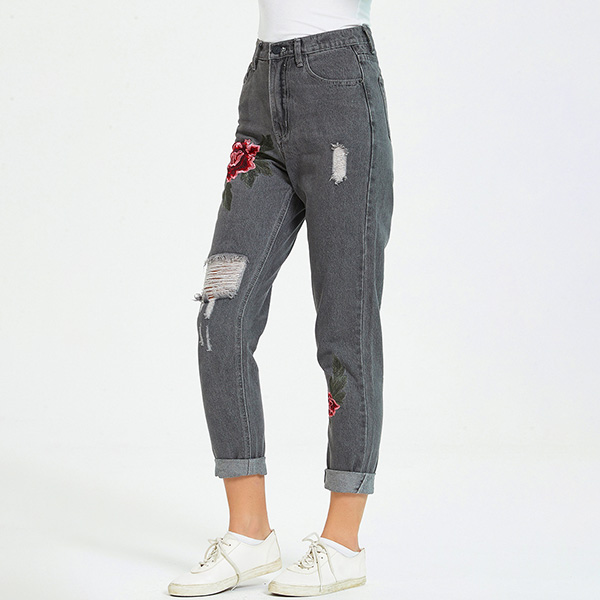 Fashion BF Style Rose Embroidery Distreeted Old-washed Denim Jeans