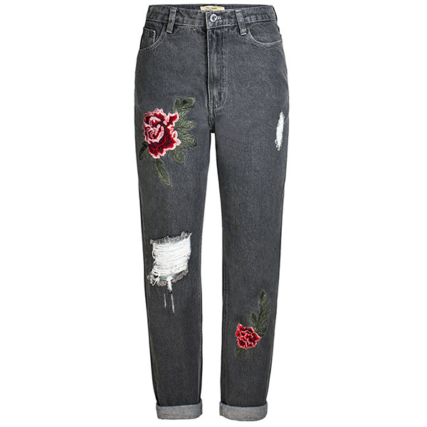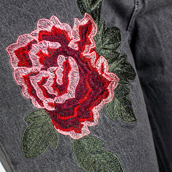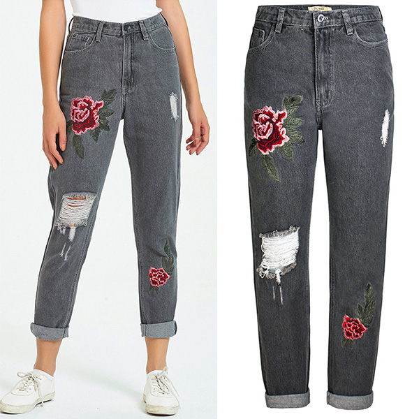 This is a trendy and edgy pair of jeans that combines a boyfriend style with feminine rose embroidery for a unique and fashionable look. Wanna have one?