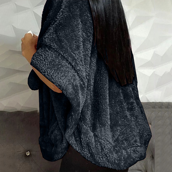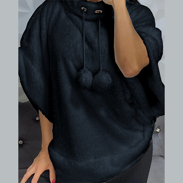 This cape sweater is perfect for layering over any outfit for a cozy and fashionable look. Made from a soft and cozy flannel fabric, this cape sweater features a drawstring pom-pom, which is chic and stylish.