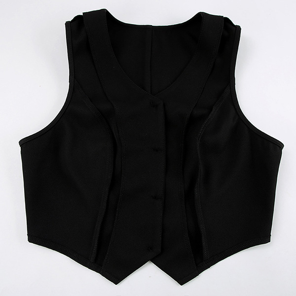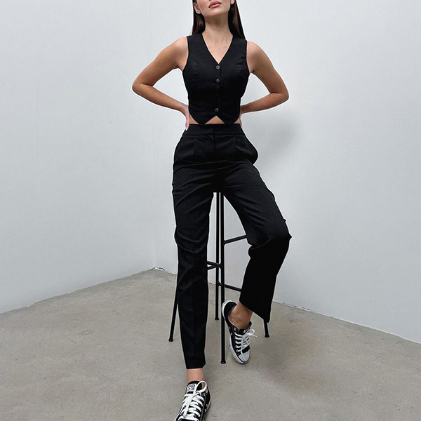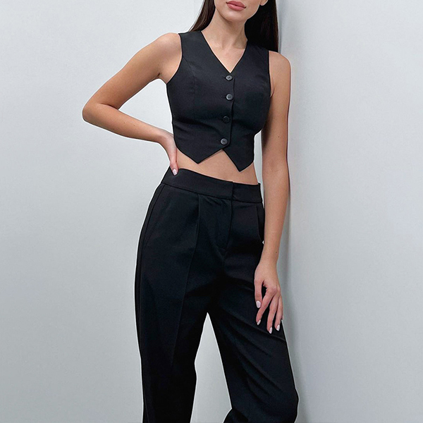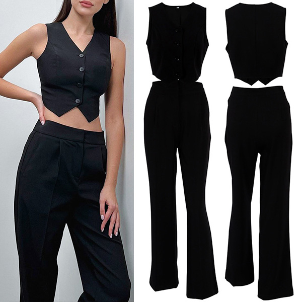 This is a trendy and versatile ensemble that combines a crop vest and straight-cut pants for a fashionable and chic look.Whether you're going for a chic and polished office look, a stylish evening outfit, or a trendy streetwear ensemble, this black two-piece set is a must-have.