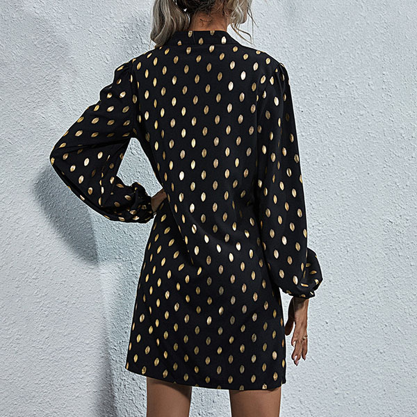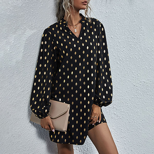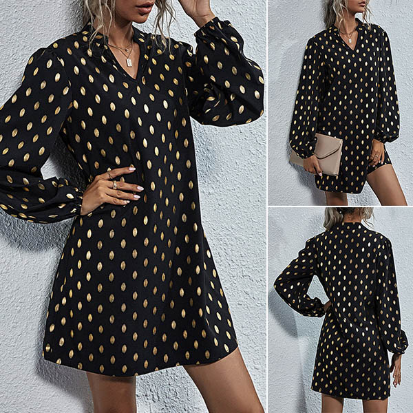 Polka dot element is very popular in recent years. Whether it is street photography or T-stage, you can always find its existence. This black dress comes with V-neck and long sleeve, finished with golden polka dots, which can showcase your mature feminine temperament perfectly. Choose this piece, be an elegant lady!