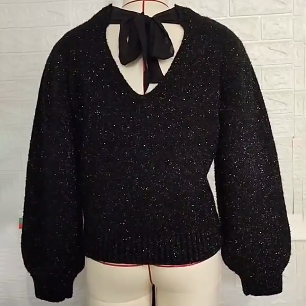 Look at this sweater! The bling-bling detailing adds a touch of shimmer and glamour to the sweater. The crew neck with back self-tie bowknot design offers a classic and chic look. Wear it with jeans and sneakers for a more casual and trendy ensemble.