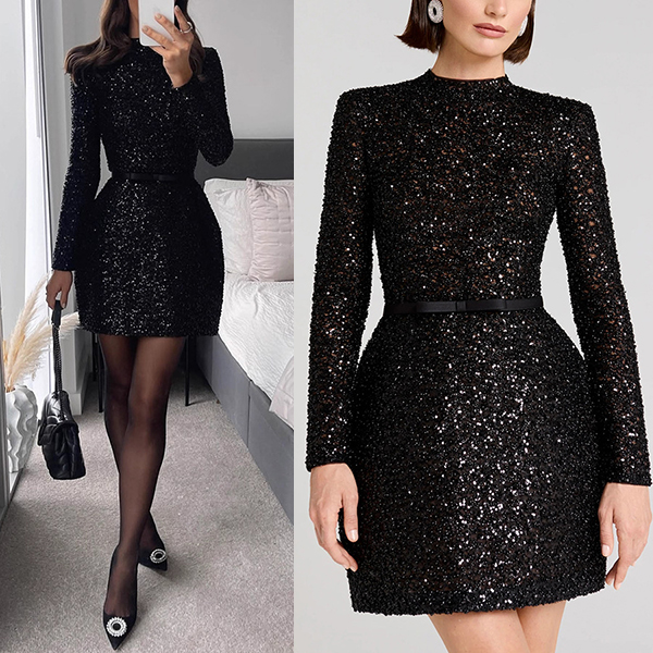 Fashion Bling-bling Crew Neck Long Sleeve Sequined Dress with Belt