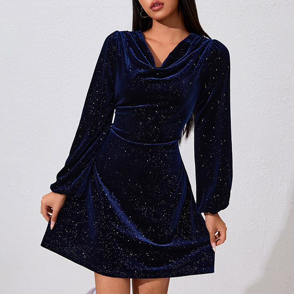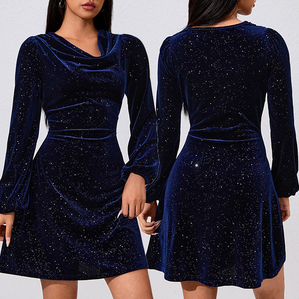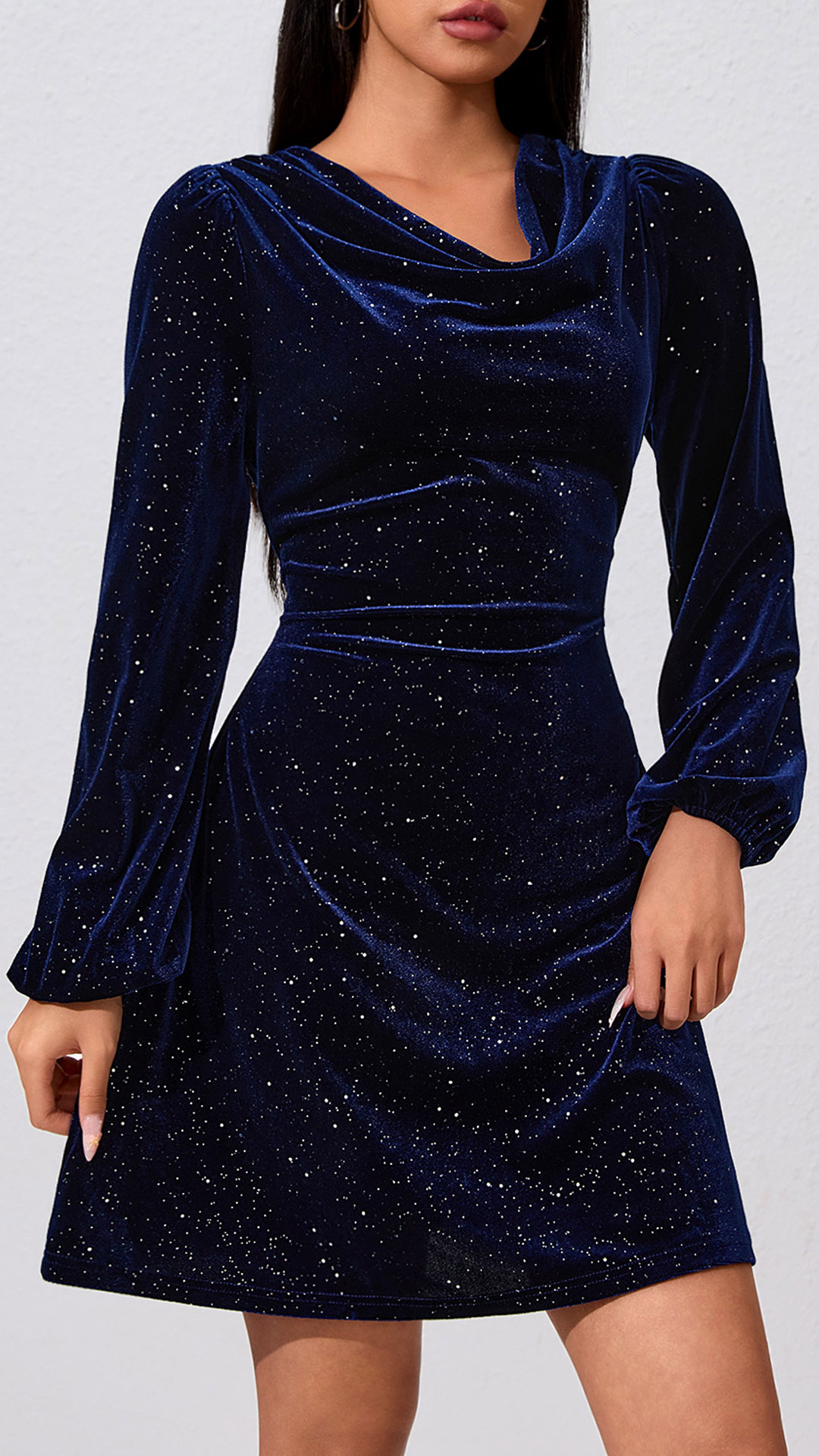 Look at this bling-bling dress! The draped neck design creates an elegant and sophisticated look, while the long sleeves add a hint of modesty and class. The mini length of the dress adds a flirty and playful touch, perfect for showcasing your legs and adding a youthful vibe to your outfit.