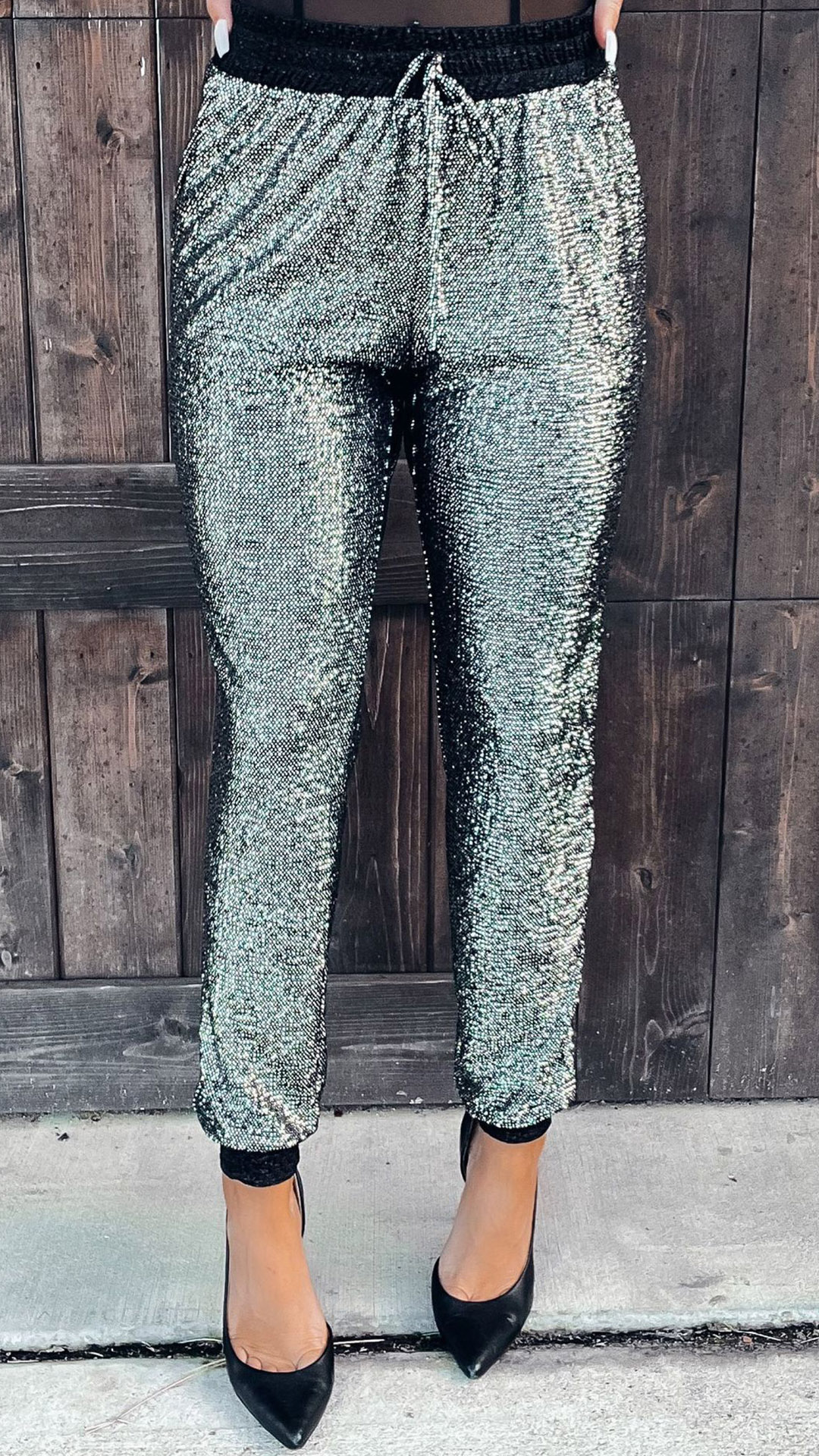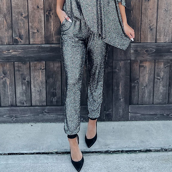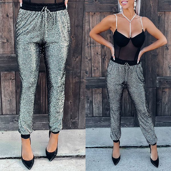 These pants feature a drawstring waist and a stylish bling-bling design. The bling-bling design gives these pants a unique and eye-catching look, making them perfect for a night out or a special occasion.