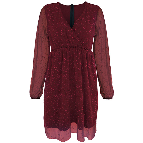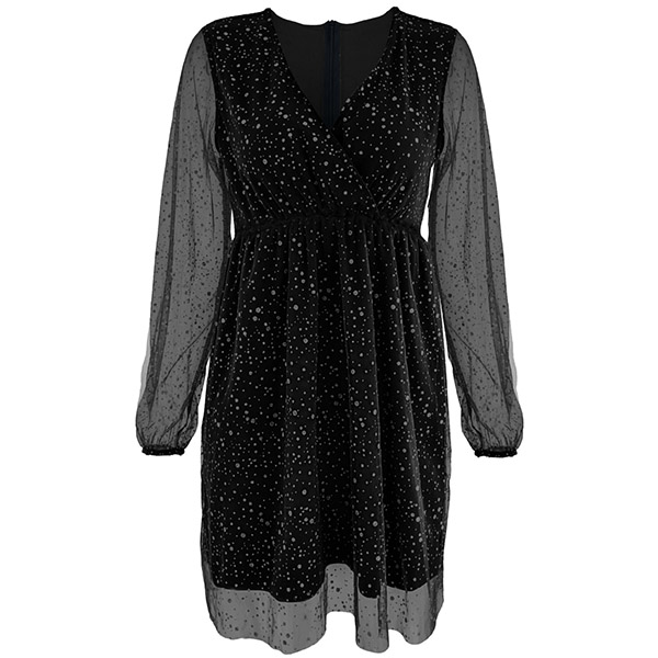 Wow! a glamorous and eye-catching dress that will make you shine at any event. The bling-bling material adds a touch of sparkle and dazzle, creating a captivating and glamorous look. The V-neckline adds a hint of allure and sophistication, showcasing your collarbone and neckline. The semi-through gauze spliced 3/4-long sleeves provide coverage while still maintaining a chic and fashionable vibe. Perfect for next party wear!
