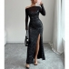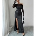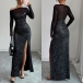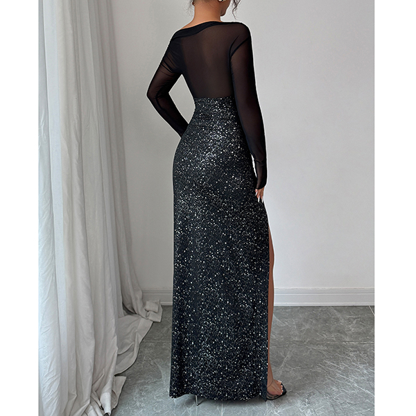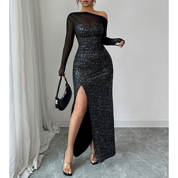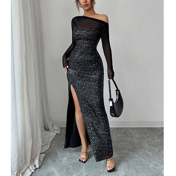 Fashion Bling-bling Gauze Spliced Slant Shoulder Long Sleeve Side Slit Maxi Party Dress