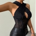 A sexy and fashion bodysuit~The bling-bling rhinestone detailing adds a touch of sparkle and luxury to the bodysuit, creating a dazzling look that is sure to turn heads. The halter neck design with a cross detail offers a unique and eye-catching neckline that adds a touch of elegance and allure to the bodysuit. Featuring a front cut-out design and a backless silhouette, this corset bodysuit exudes a sexy and daring vibe that is perfect for making a statement. Pair it with high-waisted pants or a skirt for a chic and edgy look.