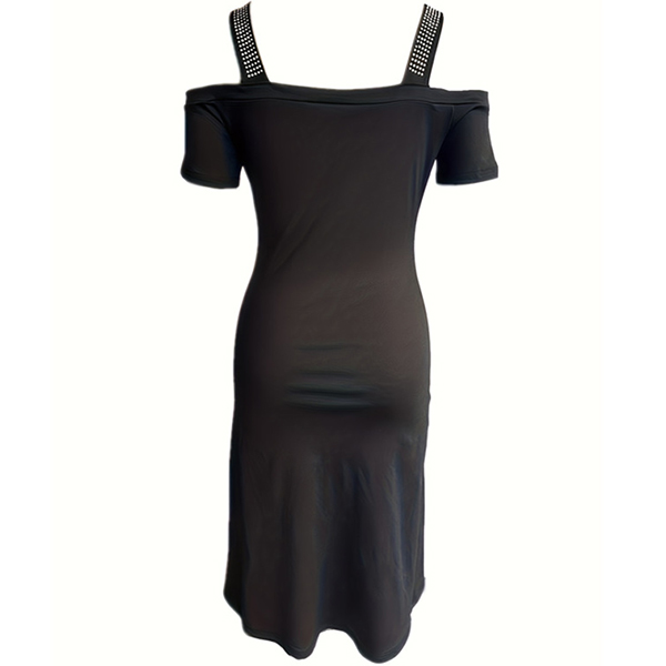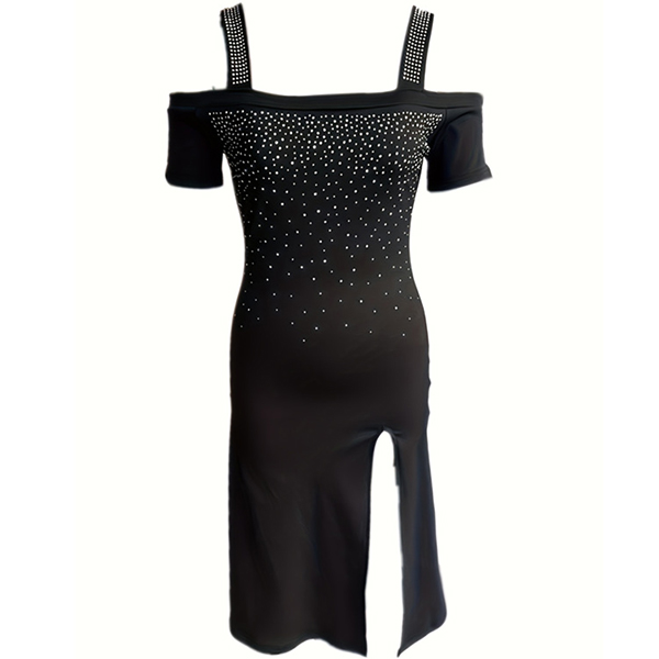 Look at this party dress! It features bling-bling rhinestone embellishment, an off-the-shoulder neckline, and a stylish front slit for a stunning and bold look. It is perfect for any party or special event.