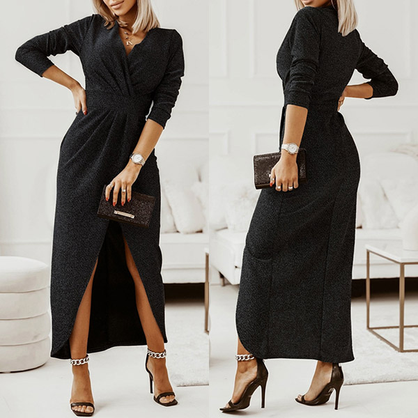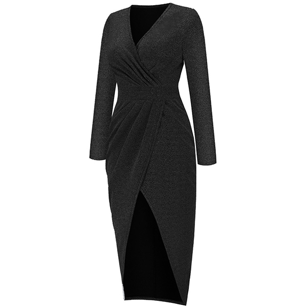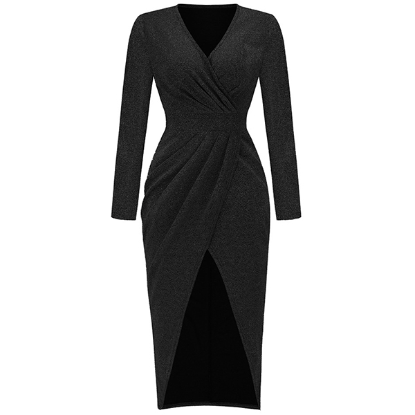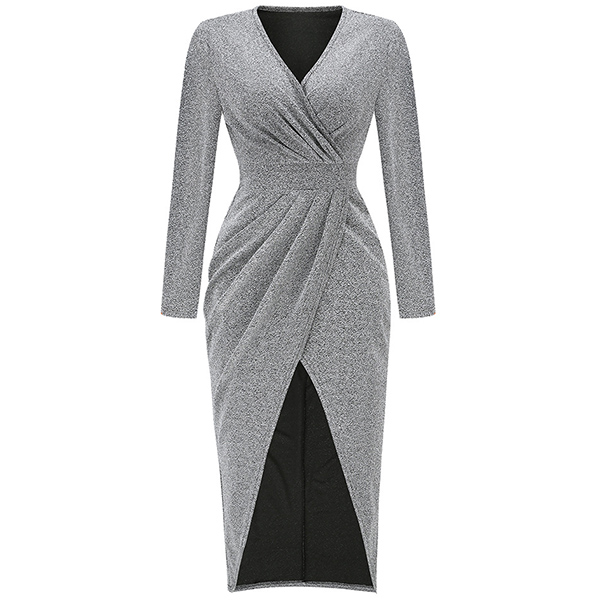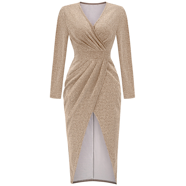 Looking for a show-stopping dress that is sure to turn heads? Try this Bling-bling dress! The ruched v-neck and long sleeves are both flattering and stylish, while the high waist slit and high-low hemline add a touch of drama. The best part? It is made of bling-blingmaterial, whether you're headed to a party or a special event, this dress is sure to make you the center of attention.