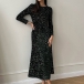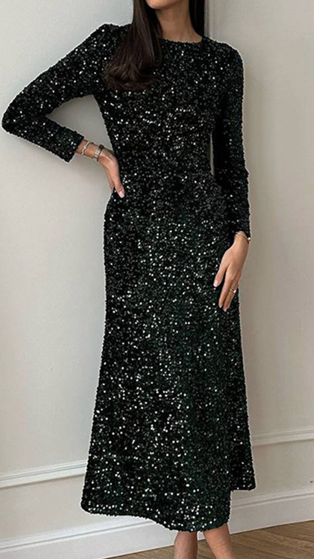 How about this drss? The bling-bling sequin detailing creates a shimmering and eye-catching effect, while the crew neck and long sleeves add a touch of elegance and style. The midi length of the dress is flattering and versatile, making it suitable for a variety of occasions, from cocktail parties to formal events. Wanna have a try?