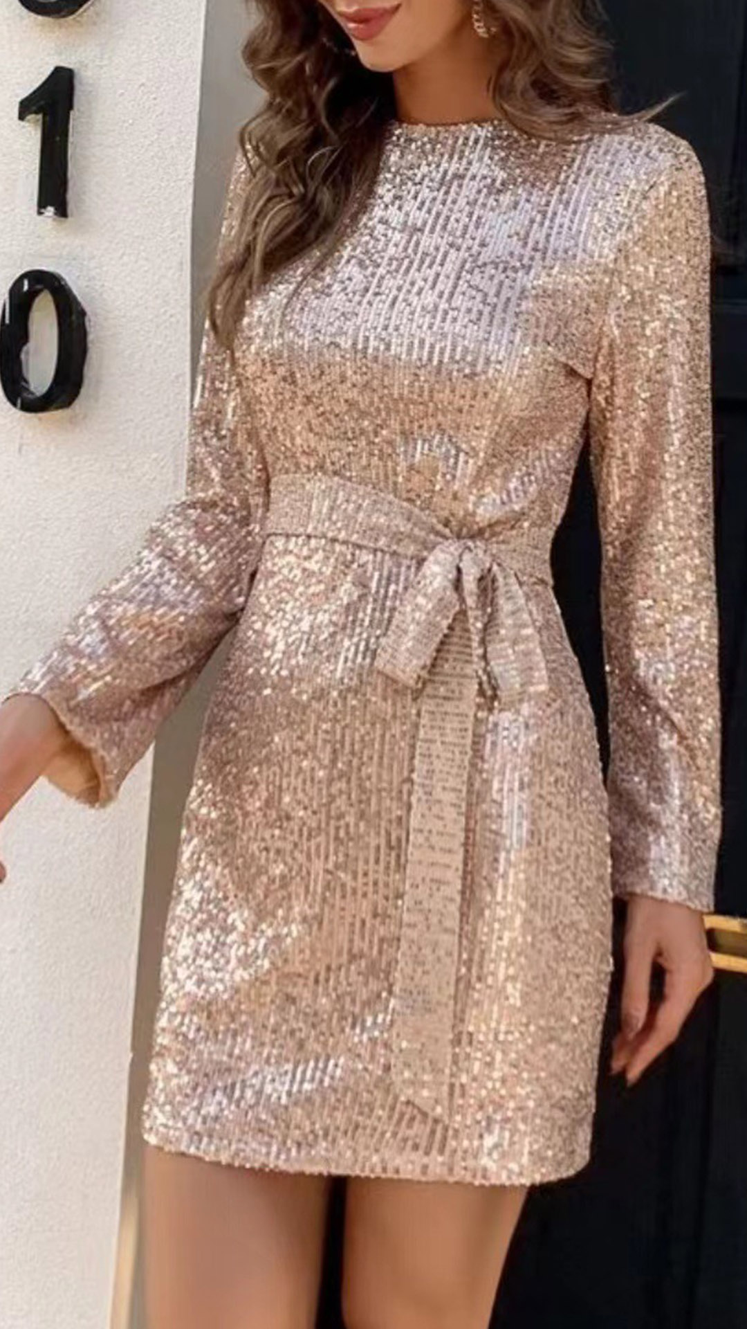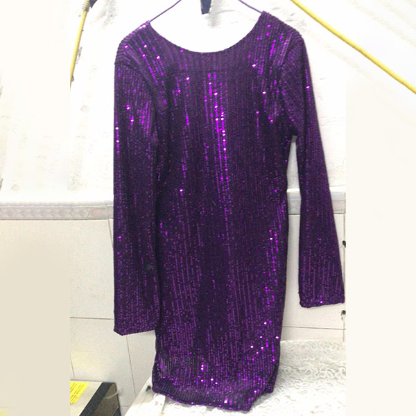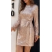 Fashion Bling-bling Sequin Round Neck Long Sleeve Backless Self-tie Mini Dress