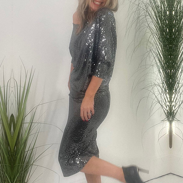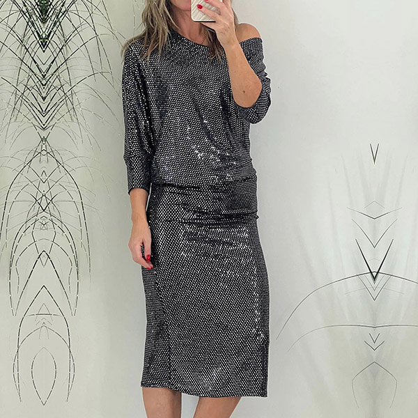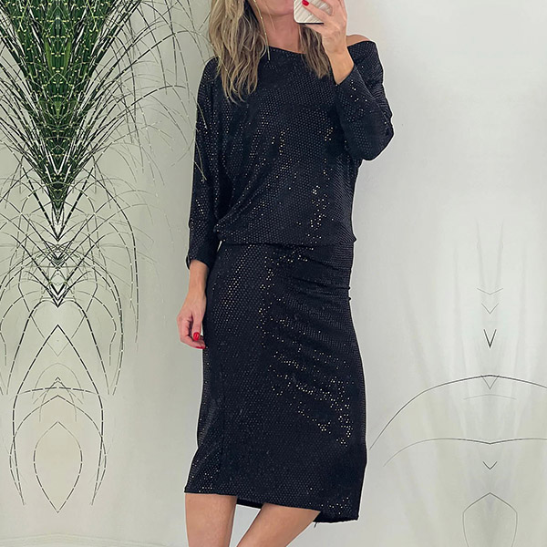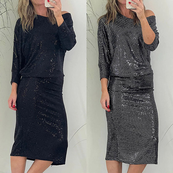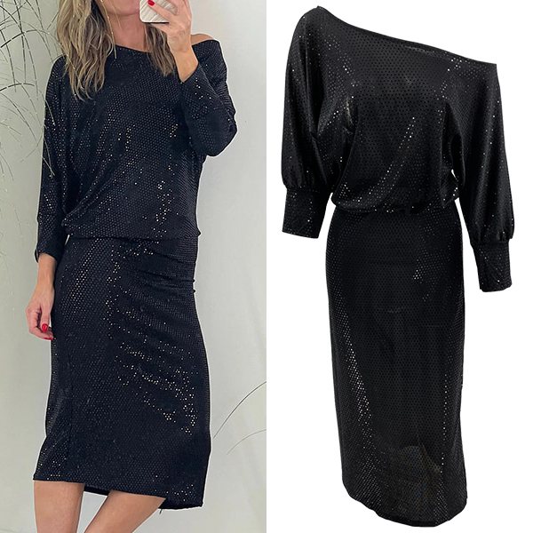 Featuring a round neck and long sleeves, this dress exudes elegance and sophistication. The sequin detailing adds a touch of sparkle and glamour, making it perfect for special occasions or parties. This dress is designed to make a statement and turn heads wherever you go.