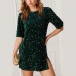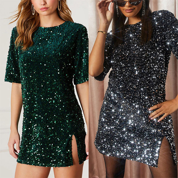 This is a glamorous and show-stopping mini dress that combines bling-bling sequins with a round neck and a slit detail for a fashionable and eye-catching look. Pair it with strappy heels and statement earrings for a glamorous and elegant look.