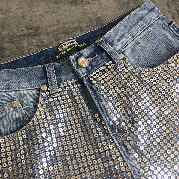 5-pocket jeans in washed denim with low waist, zip fly with button, and a skinny legs. Sequin front and distressed holds enhance the design style as well as boost your personality.Perfect fit for matching with different style crop tops.