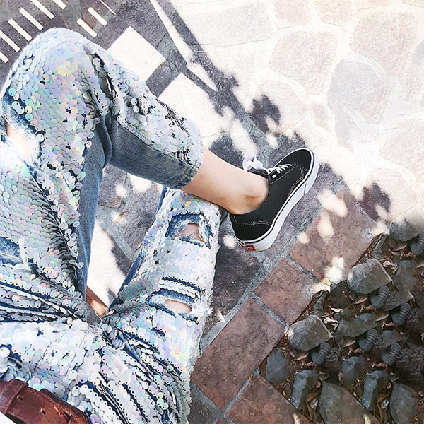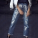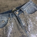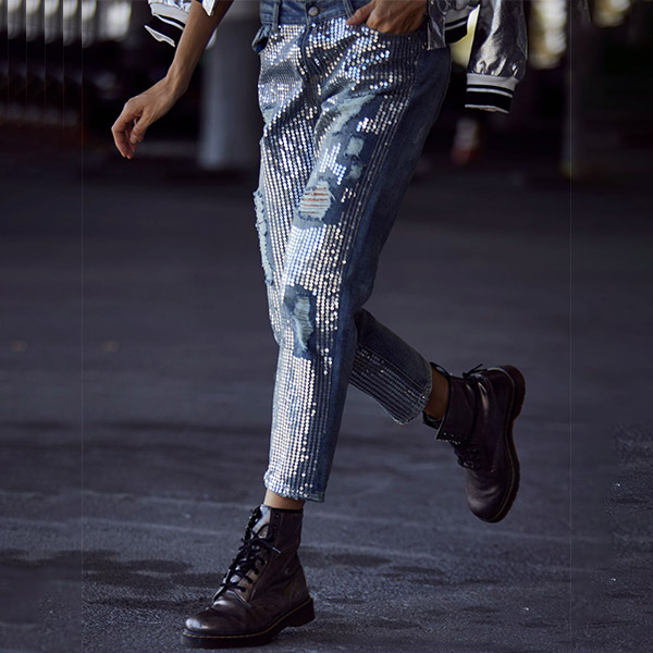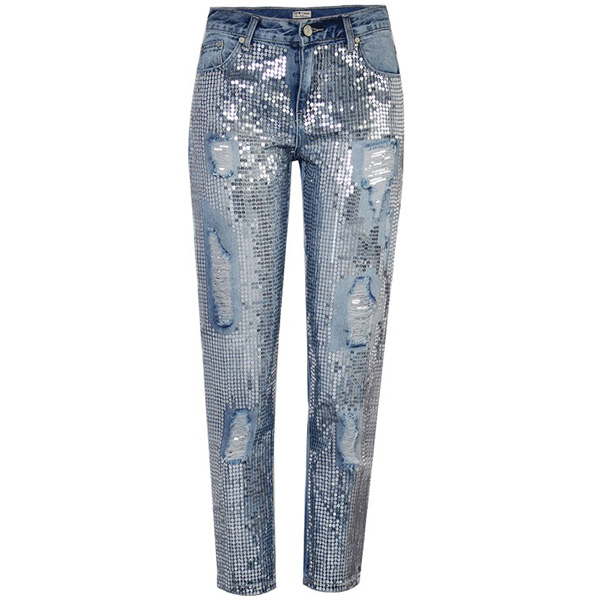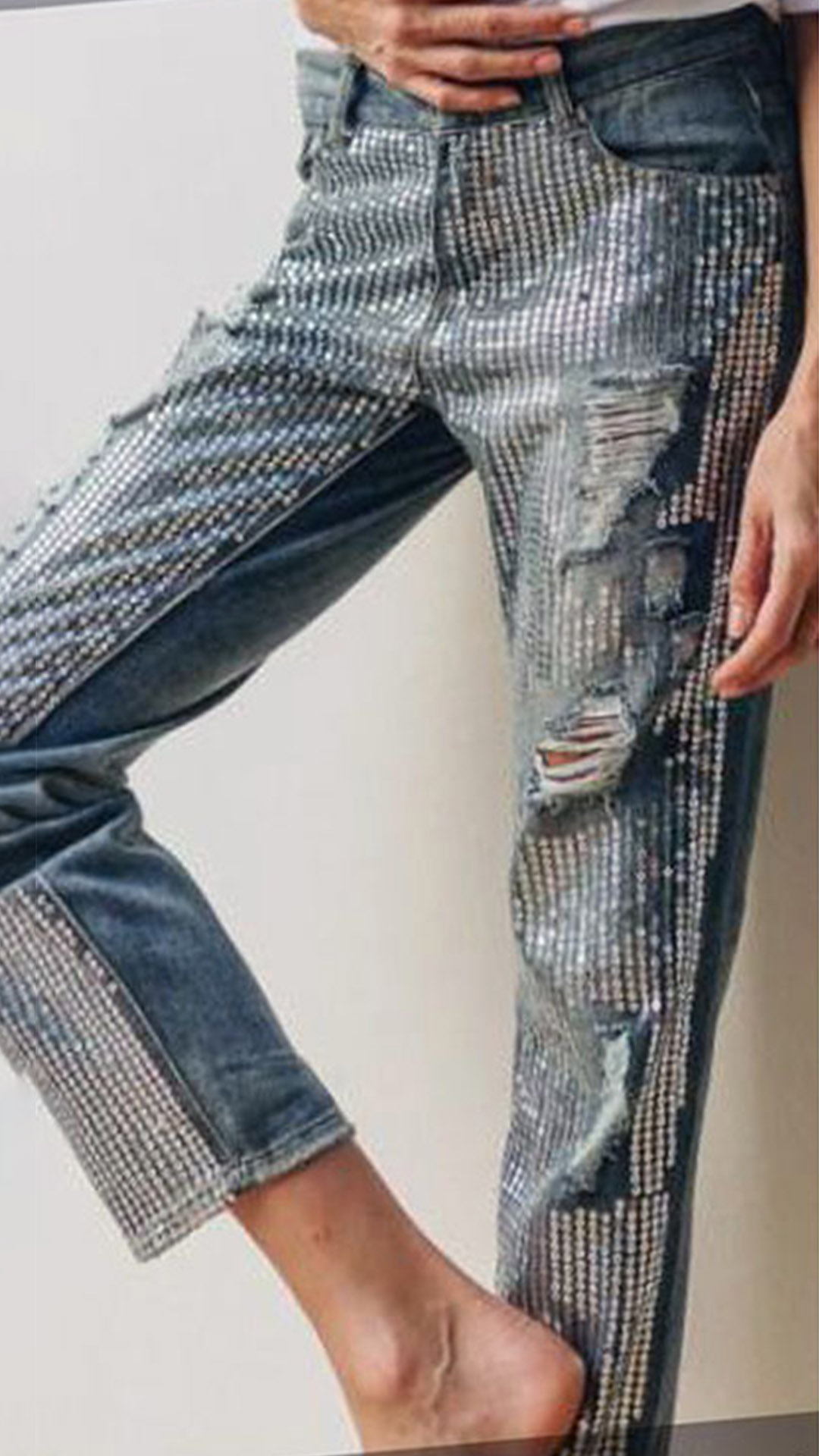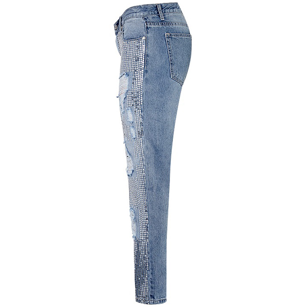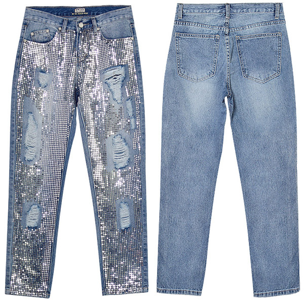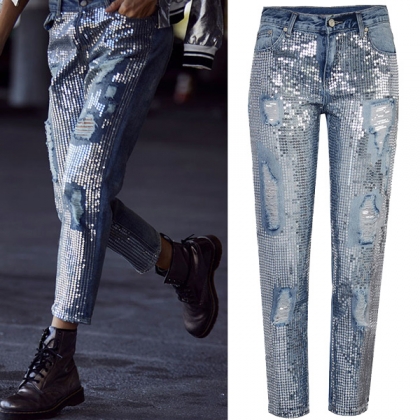 Fashion Bling-Bling Sequin Spliced Distressed Holes Low-waist Ankle Jeans