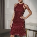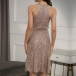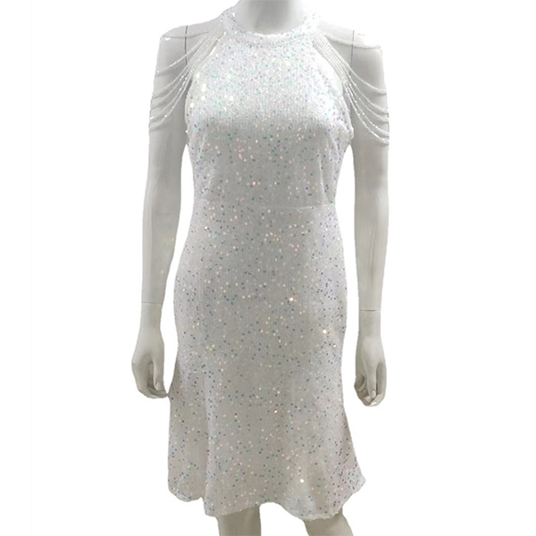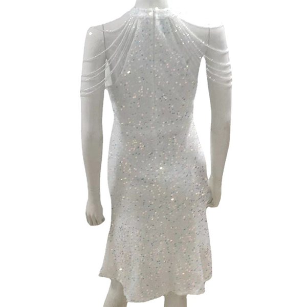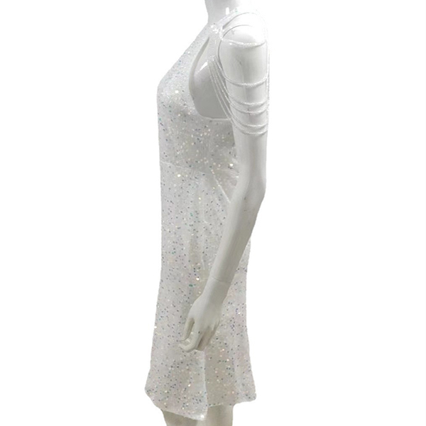Make a statement at your next party with this fashion-forward bling-bling party dress. The dress is adorned with shimmering sequins that catch the light and create a stunning effect. The tassel detailing along the shoulder adds a playful and festive touch, making it the perfect choice for a night of dancing and celebration. The dress features a flattering silhouette that hugs your curves in all the right places, enhancing your natural beauty.