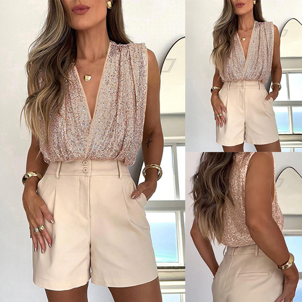Shine and dazzle in this Bling-bling Bodysuit. This glamorous bodysuit features an eye-catching sequin design, a flattering V-neckline, and a sleeveless silhouette, creating a show-stopping and fashionable look. You could pair it with high-waisted pants, a skirt, or tailored trousers