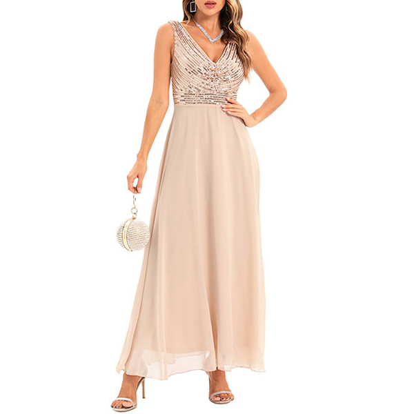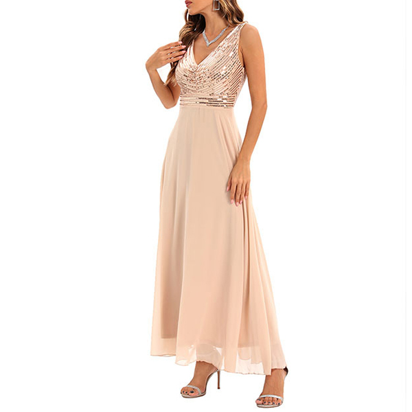 This party dress would help you stand out of crowd easily! It features a bling-bling bodice, and is spliced with a chiffon skirt, which is chic and stylish! The V-neckline and sleeveless design offer a classic and sophisticated look, while the sequined fabric brings a touch of bling-bling glamour to the overall look. Wanna have a try?