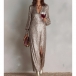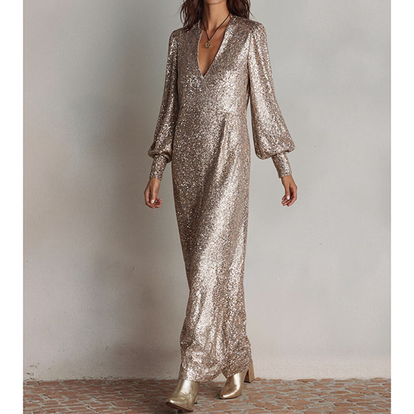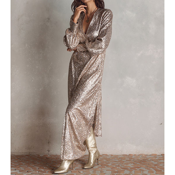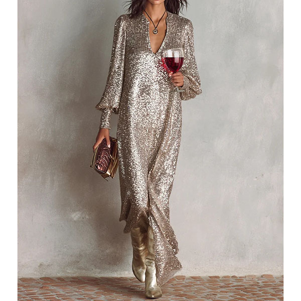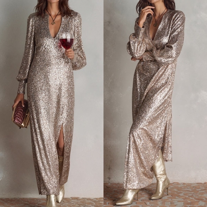 Fashion Bling-bling Sequined V-neck Long Sleeve Side Slit Maxi Party Dress