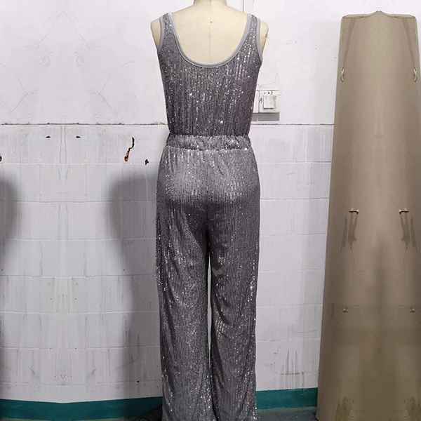 Fashion Bling-bling Square Neck Sleeveless Drawstring Waist Jumpsuit