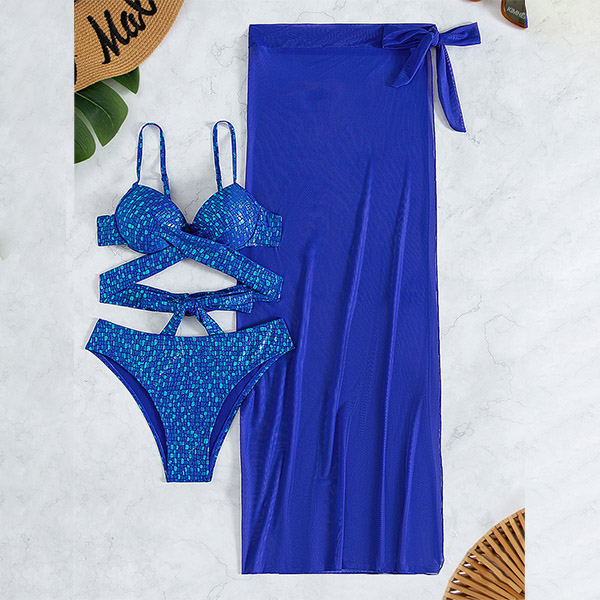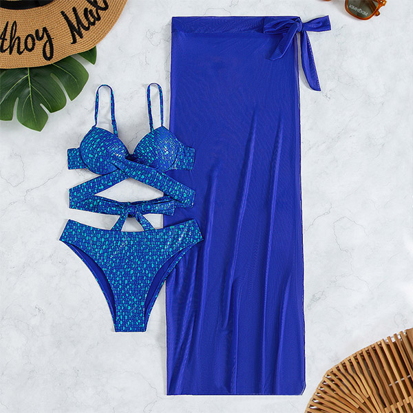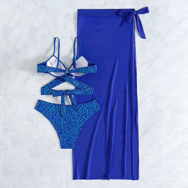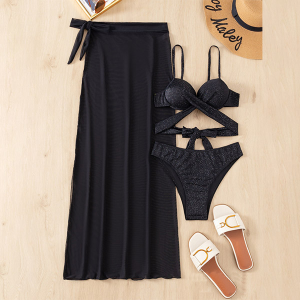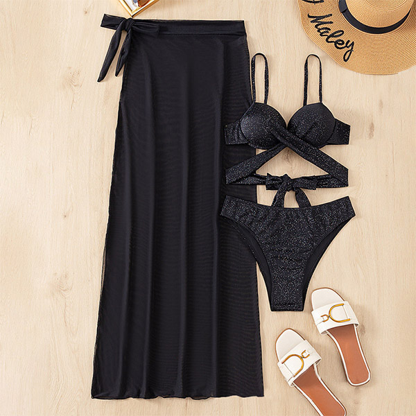 Fashion Bling-bling Three-piece Bikini Set Consist of Cross-criss Bikini Top, High-waist Bikini Bottom and Slit Swim Cover-up Skirt