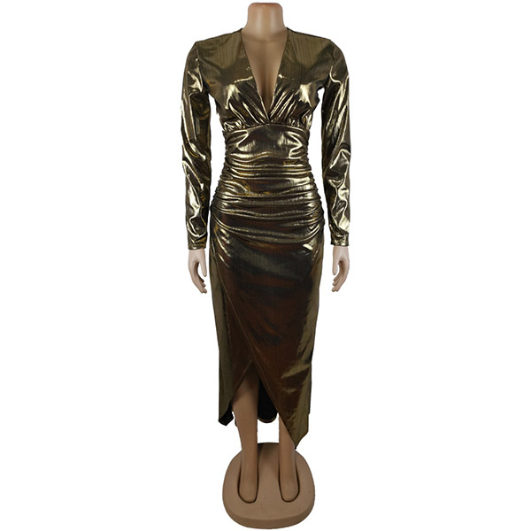 Fashion Bling-bling V-neck Long Sleeve Bodycon Slit Party Dress
