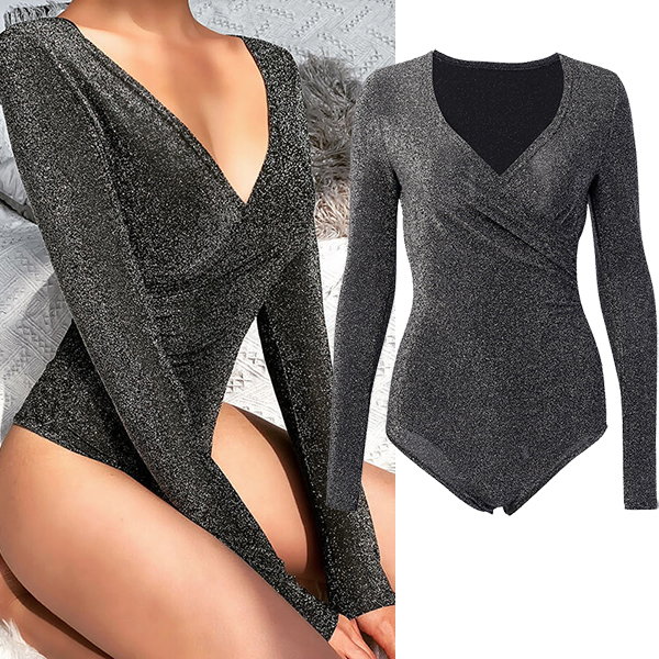 This bodysuit features glamorous bling-bling embellishments with flattering V-neck styling and elegant ruched detailing for contemporary luxurious elegance. Pair with high-waisted bottoms and heels for sophisticated glamorous appeal.