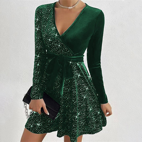 This is a glamorous and eye-catching dress that combines a bling-bling design, V-neckline, long sleeves, and a self-tie waist for a stylish and chic look.