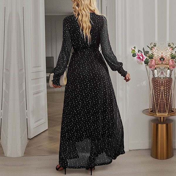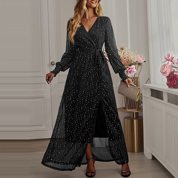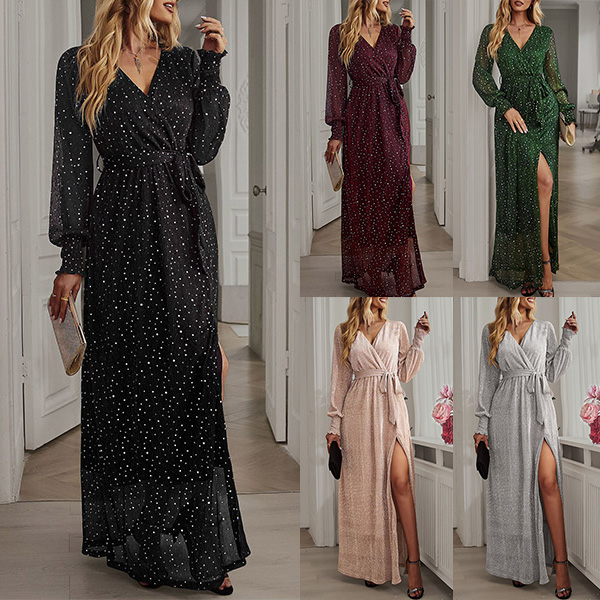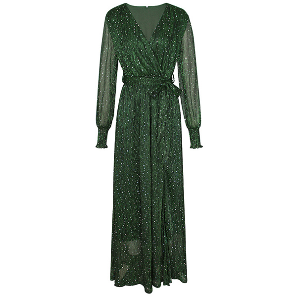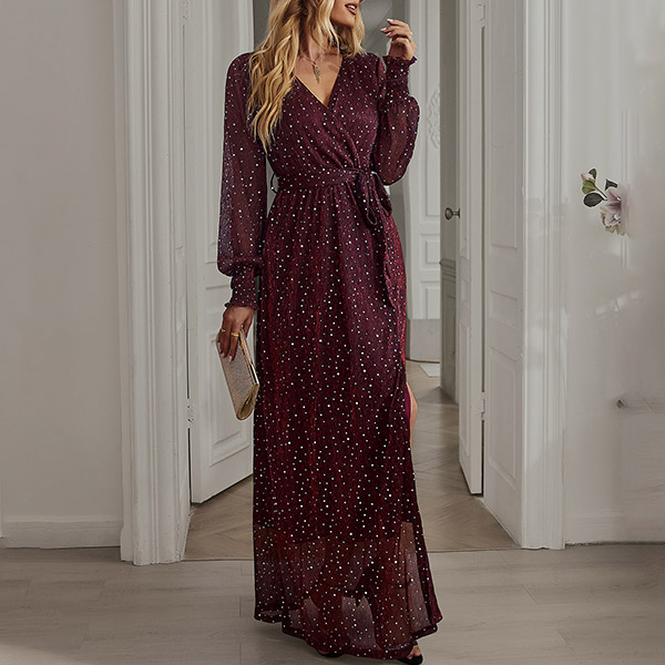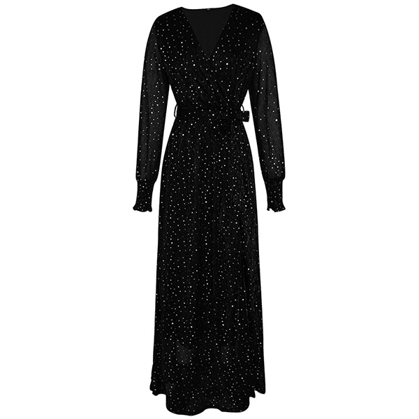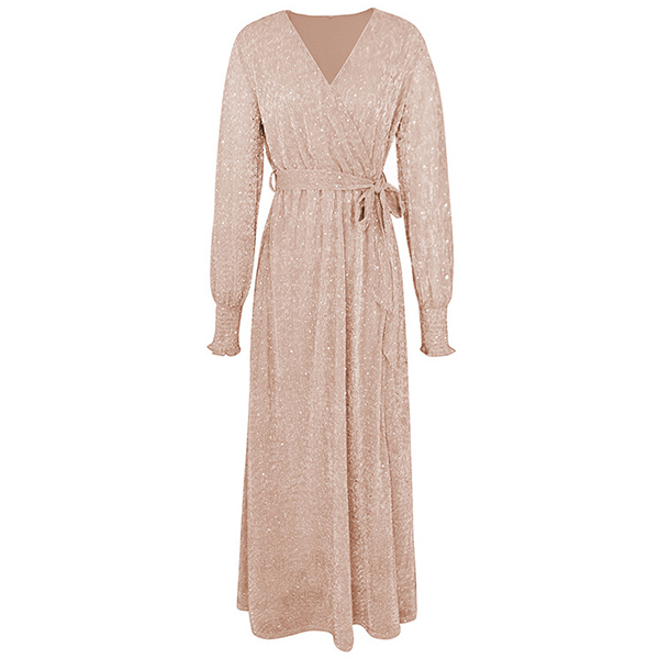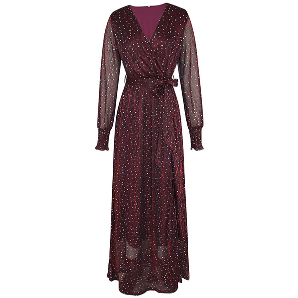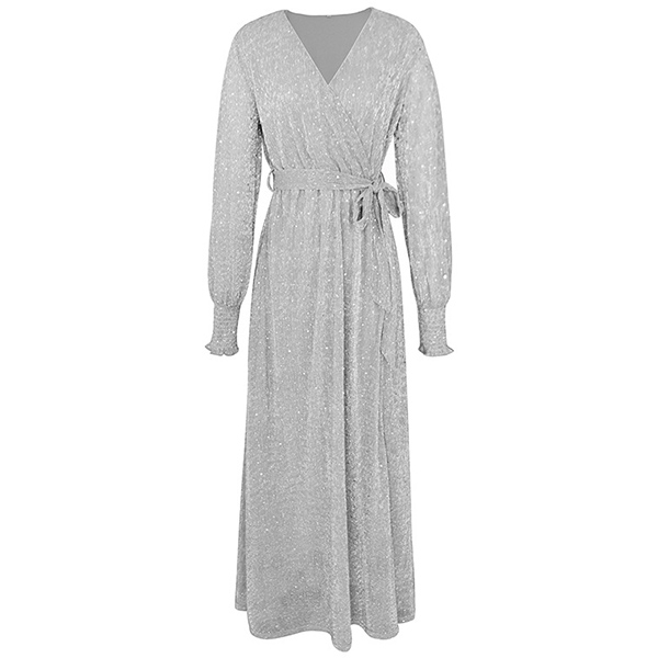 Fashion Bling-bling V-neck Long Sleeve Self-tie Wrap Party Dress
