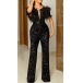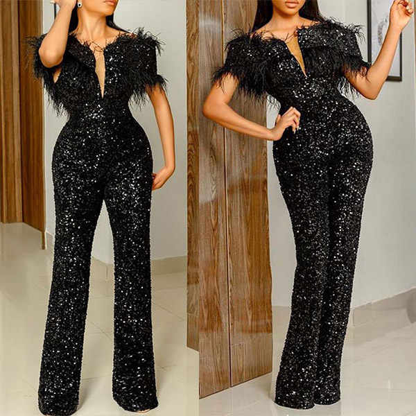 How about this jumpsuit? The sequin fabric is sure to catch the light and the feather detailing adds a touch of fun and flair. The wide-leg silhouette is both comfortable and stylish and the V-neck neckline is flattering for all body types.