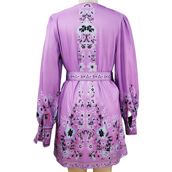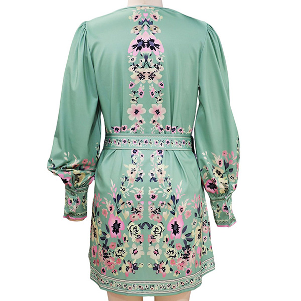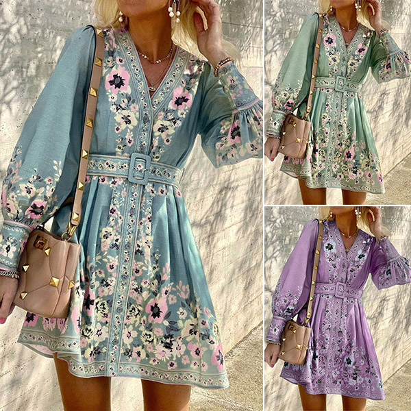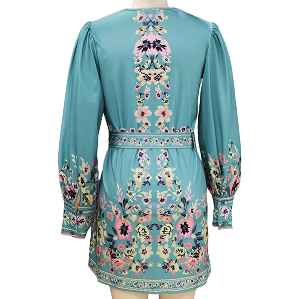 Fashion Bohemia Style Floral Printed V-neck Long Sleeve Dress