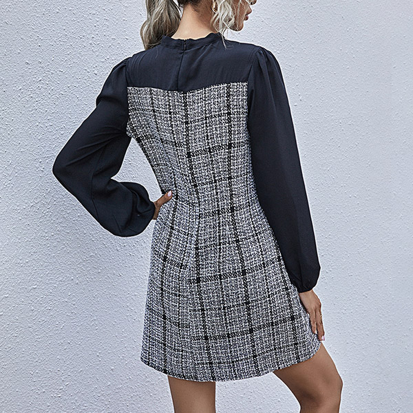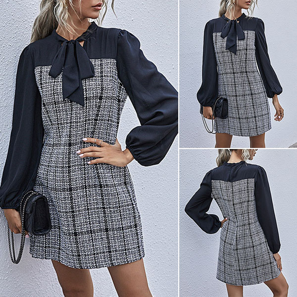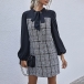 Fashion Bowknot Collar Plaid Spliced Long Sleeve Dress