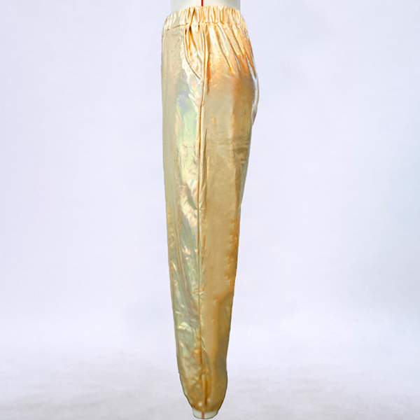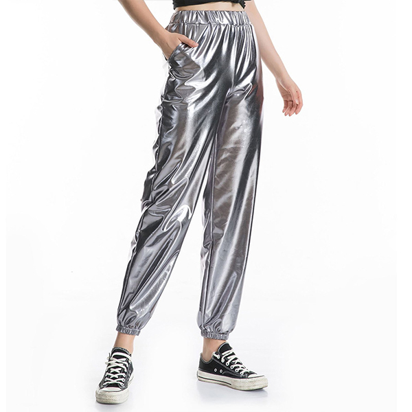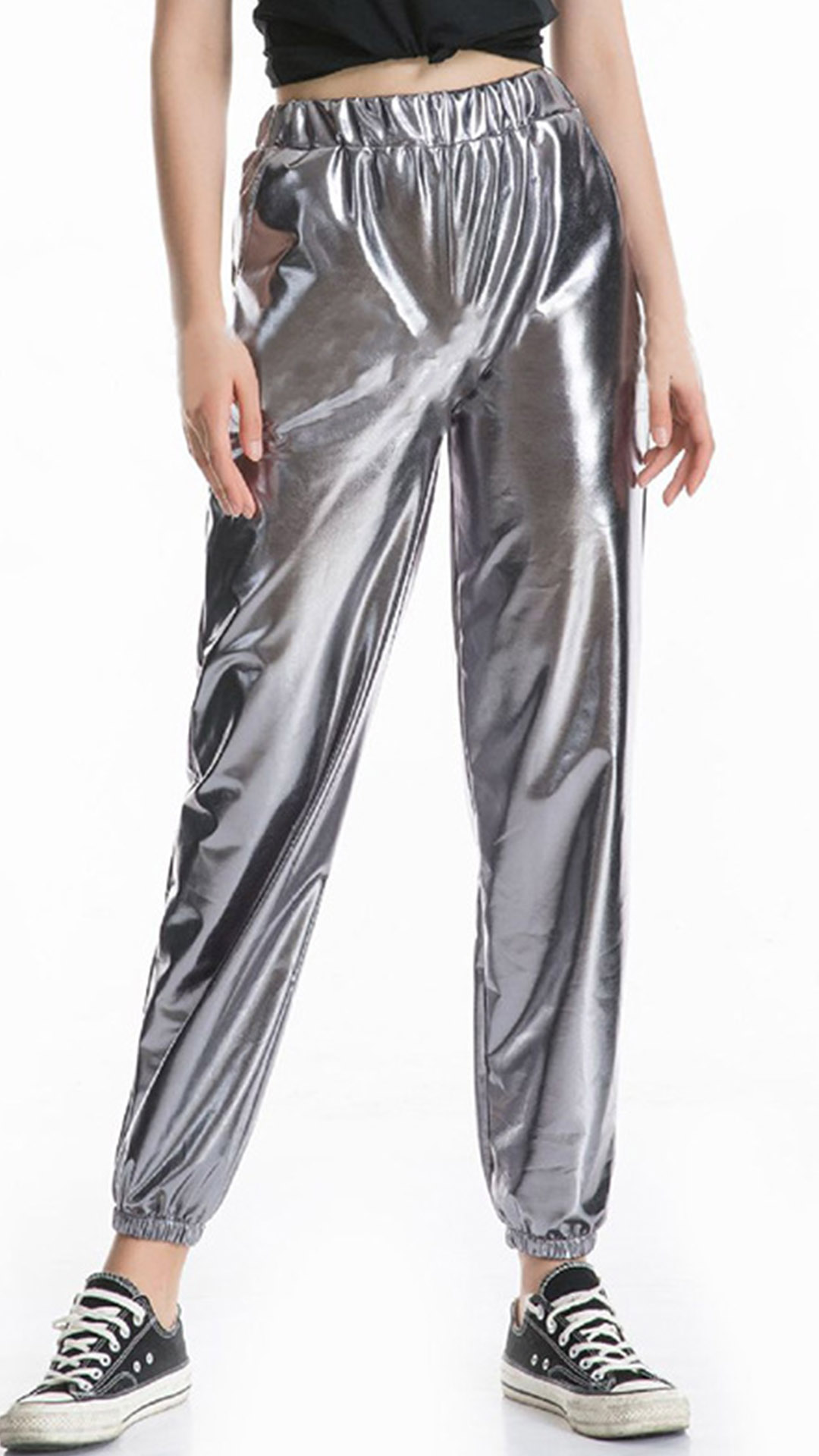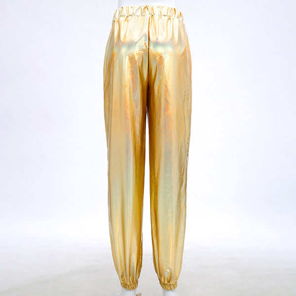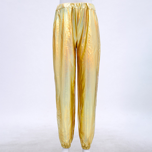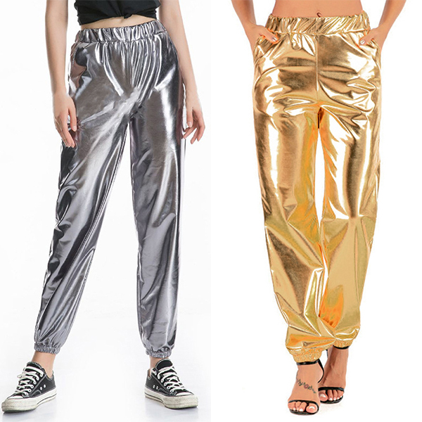 This is a bold and trendy pants that combines bright colors, an elastic waistband, and artificial leather material for a fashionable and edgy look. Perfect for party wear.