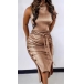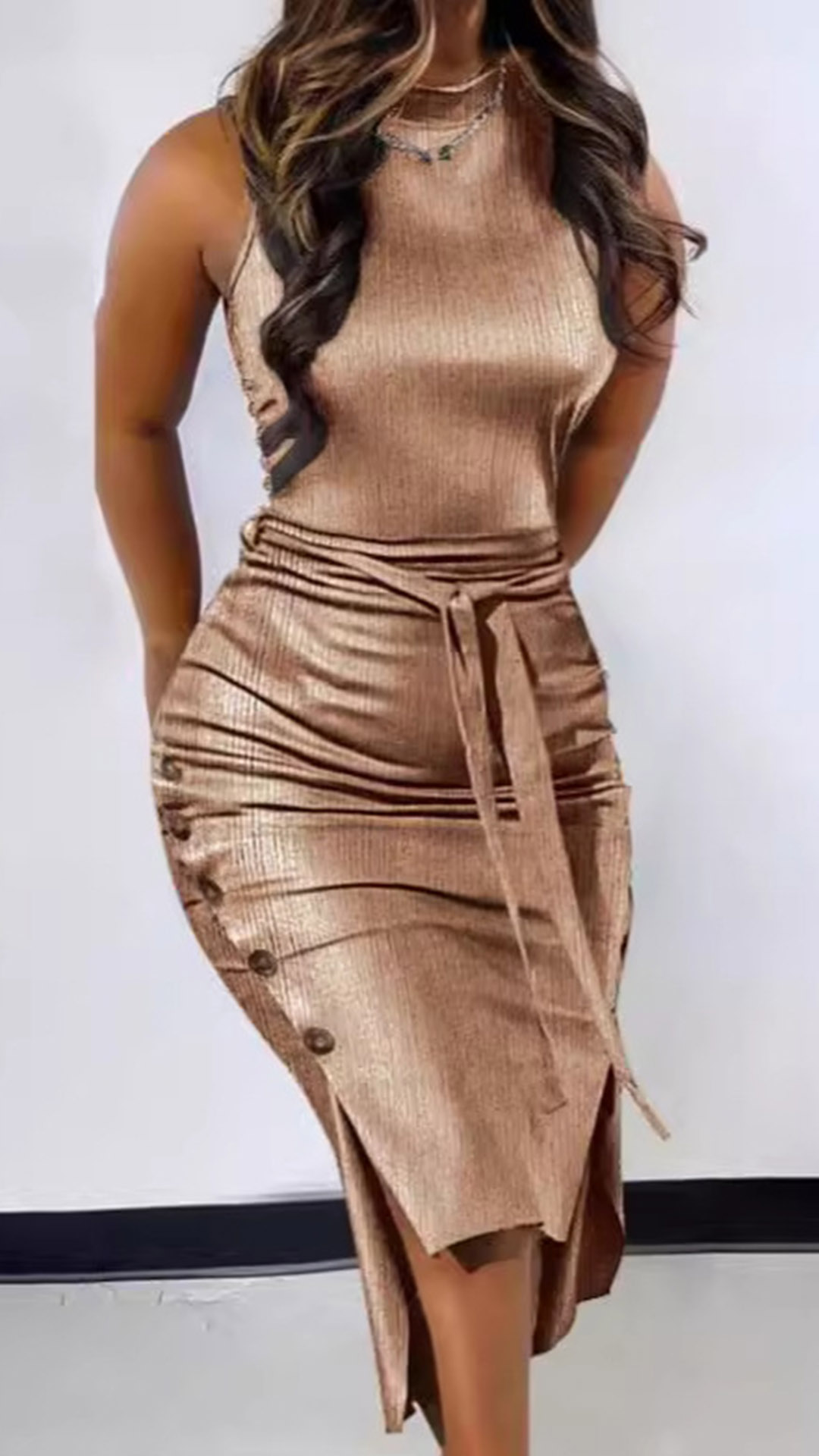 This dress features a vibrant and eye-catching bright color, a chic mock neck, a sleeveless design, a daring side slit with button decoration, and a trendy high-low hemline, creating a stunning and fashionable ensemble. Pair it with strappy heels and statement earrings for a glamorous and head-turning look.