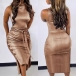 Fashion Bright Color Mock Neck Sleeveless Side Button Slit High-low Hemline Bodycon Dress