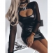 This edgy bodycon dress combines multiple contemporary elements for a bold fashion statement with urban sophistication. The artificial leather PU construction provides sleek structure while strategic gauze splicing along the long sleeve adds textural contrast and visual intrigue. The front cutout creates modern allure, while the buckle on the neckline detail brings hardware edge and the crew neckline maintains sophisticated coverage. Perfect for nightlife events, fashion-forward occasions, or anytime you want to make a confident style statement with edge.