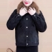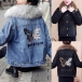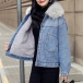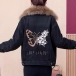 Fashion Butterfly Emboridery Detachable Artificial Fur Spliced Collar Long Sleeve Plush Lined Denim Jacket for Women
