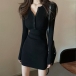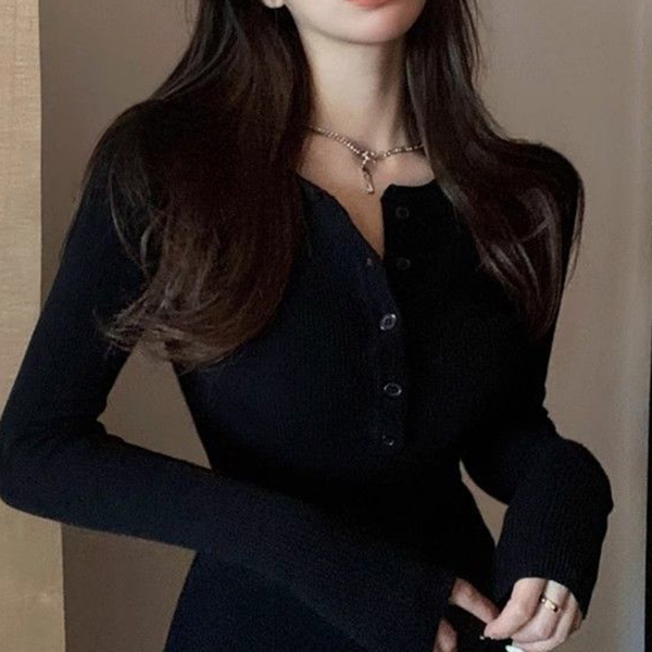 Fashion Button V-Neck Long Sleeve Ribbed Bodycon Dress