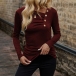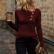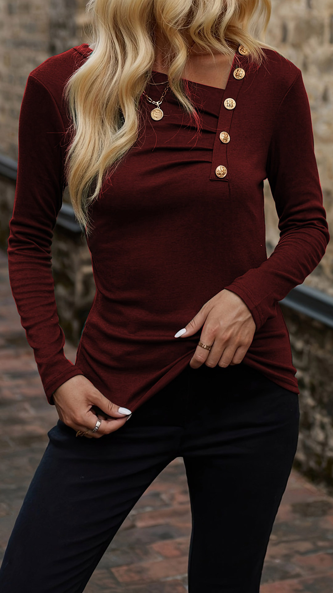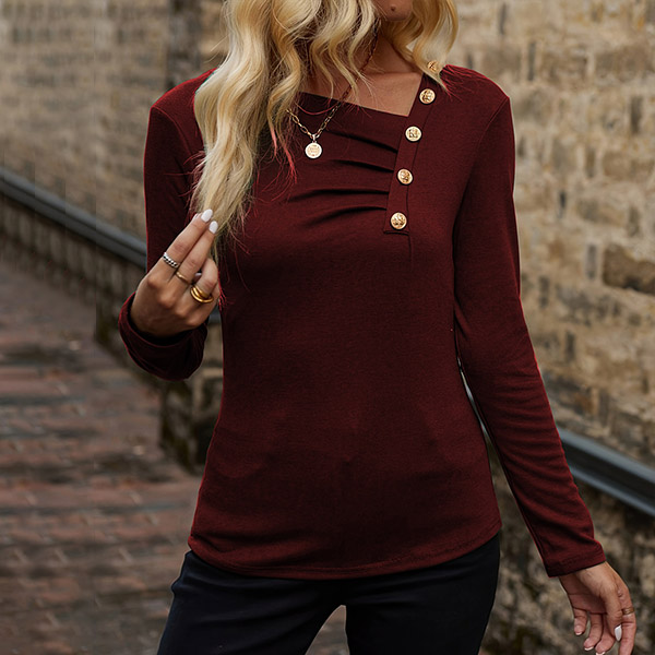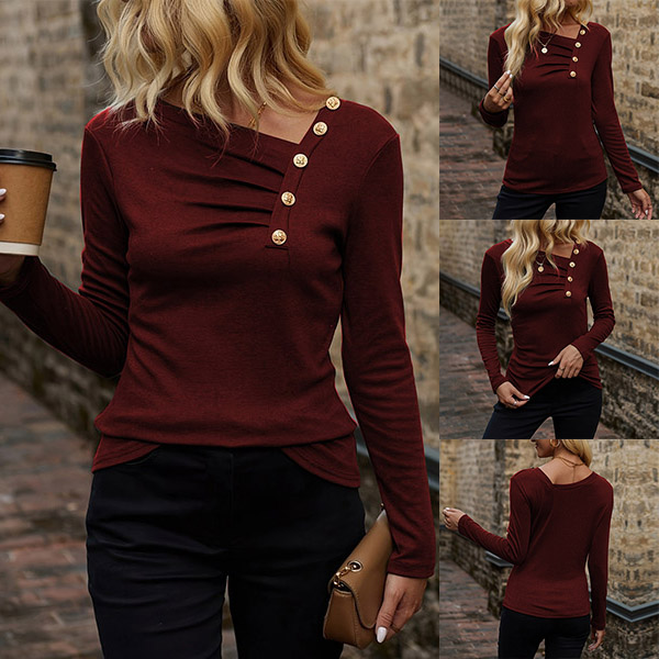 Elevate your wardrobe with this stylish and trendy shirt. It features an irregular neckline with button decoration and long sleeves. Pair it with jeans and sneakers for a more casual look.